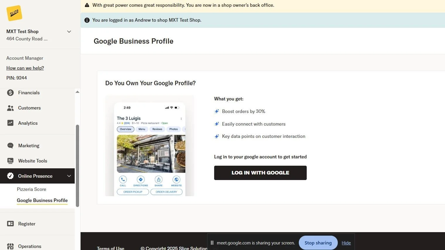 The Slice Google Business Profile (GBP) integration helps you claim your profile, become the Primary owner of your GBP, and set Slice as the manager role. Once integrated with Slice, and Slice has the “Manager” role, we ensure that your hours, menu links, and ordering options are accurate on Google, so customers always see the correct information.