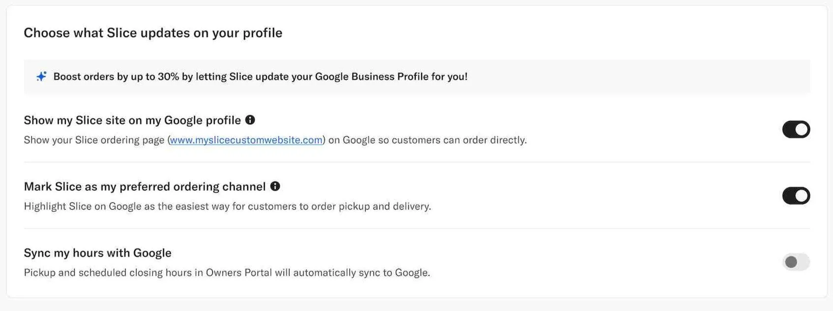 Slice will automatically sync your information daily, ensuring your Google listing always shows the correct details. If changes need to appear right away, Slice can also trigger an update manually.