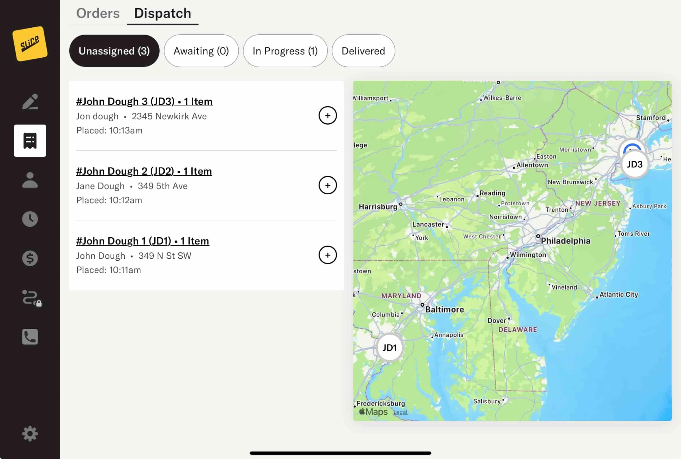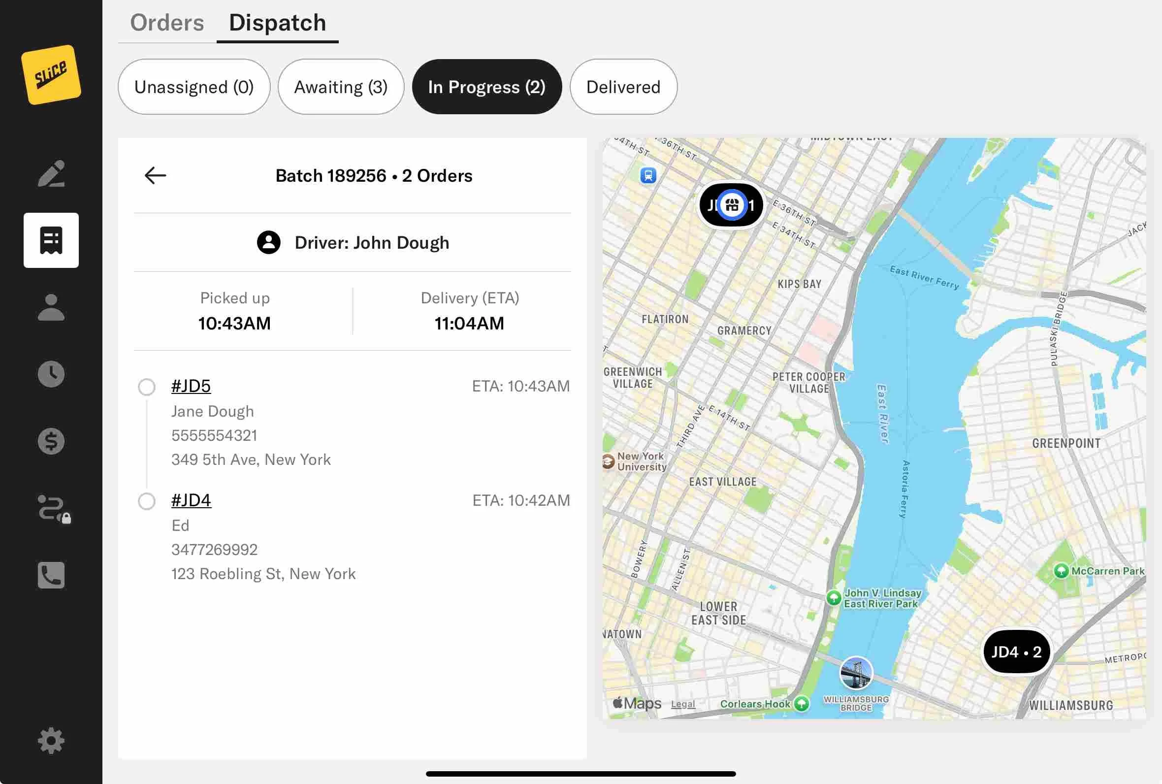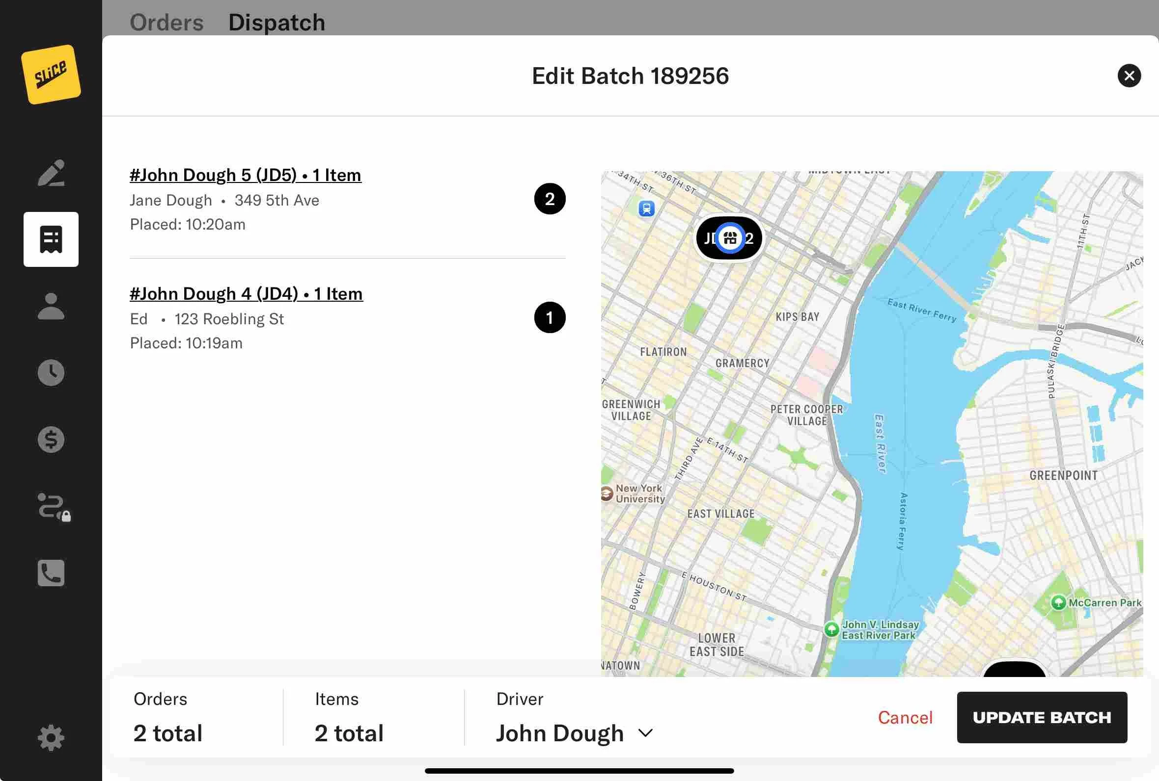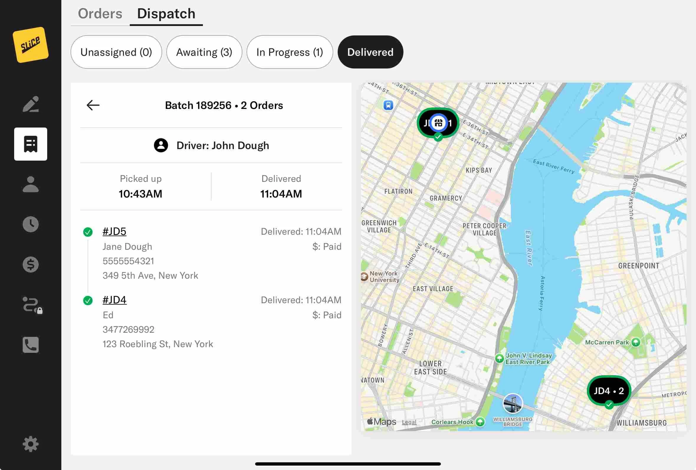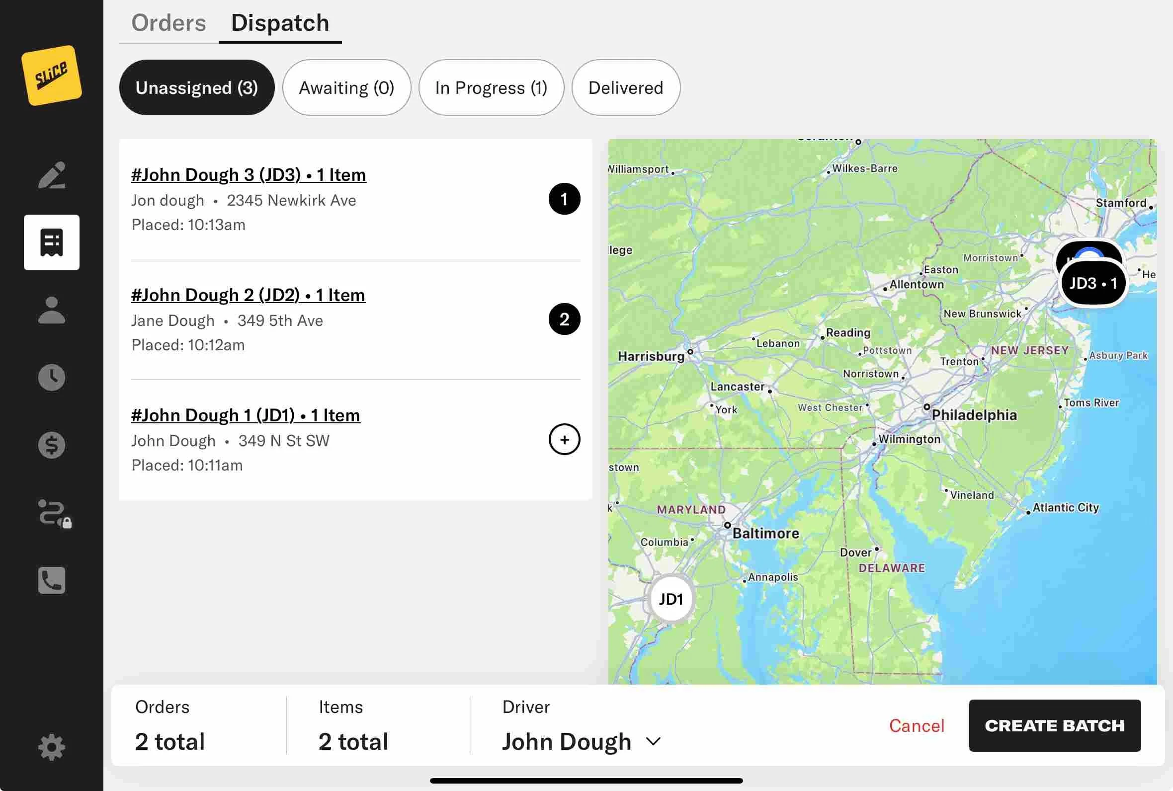 The Delivery Management page helps you organize and track your delivery orders from the moment they come in until they are delivered. This page works with the Slice Driver App so you can assign orders, create batches, follow your drivers, and confirm completed deliveries.