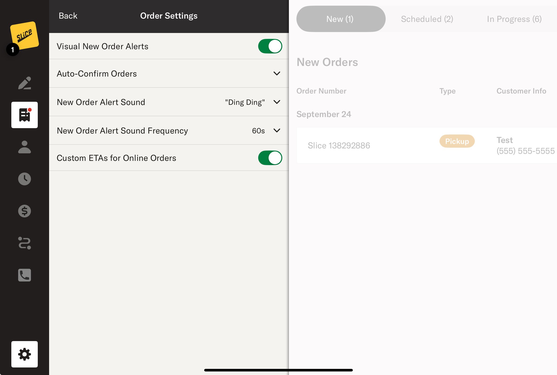 Auto-Confirm Orders: Allows Slice and third-party orders to be automatically confirmed. You can enable this separately for each order type.