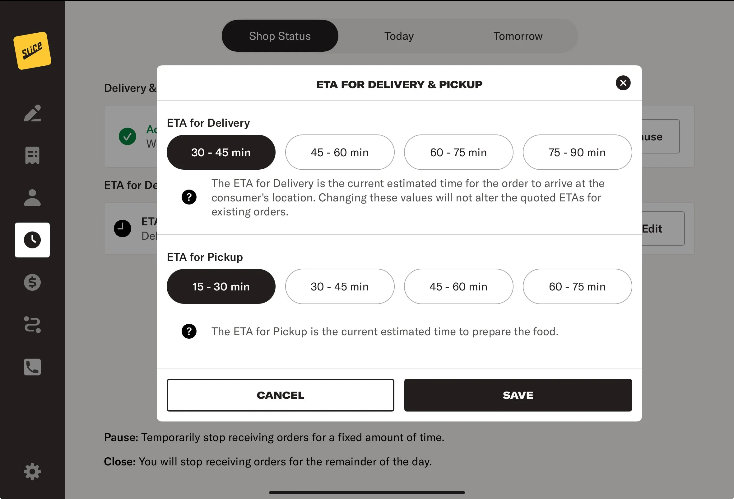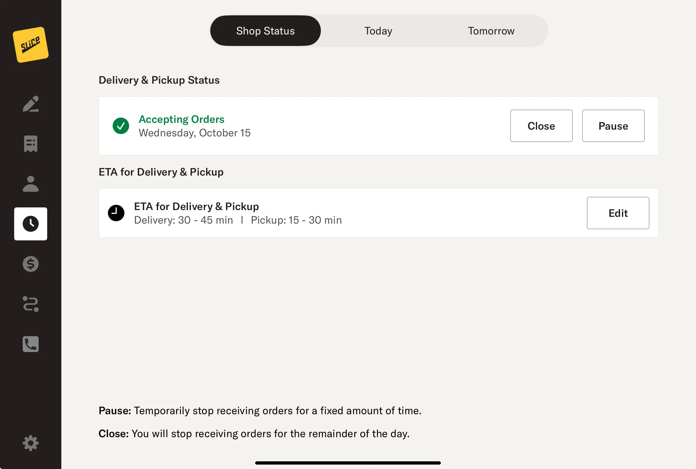 Note: Pausing or closing orders affects Slice online orders and Slice Phone orders—third-party orders will not be impacted.