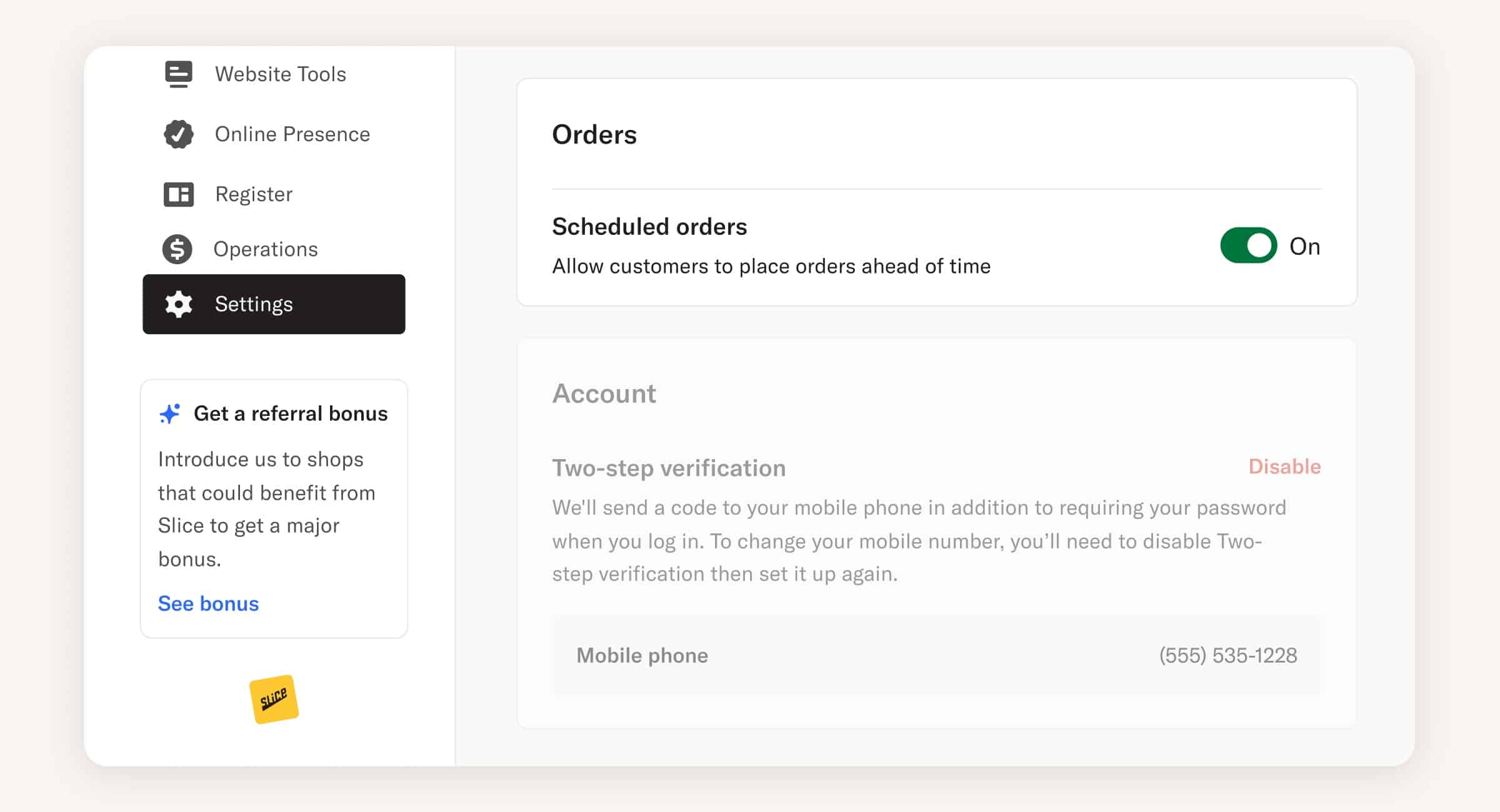 You can now turn Slice Phones on or off directly from the Register during Slice Phone operating hours. When turned off, incoming calls go straight to your shop’s phone instead of the Slice Phone team.